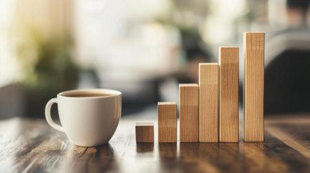 A coffee cup placed beside wooden blocks forming a bar chart, reflecting business growth and success in a sleek, modern office space.
