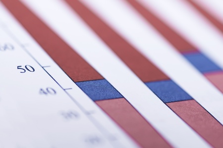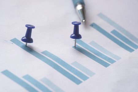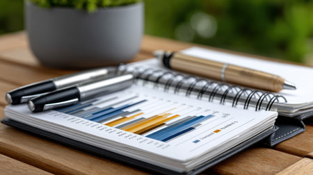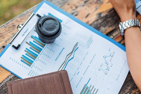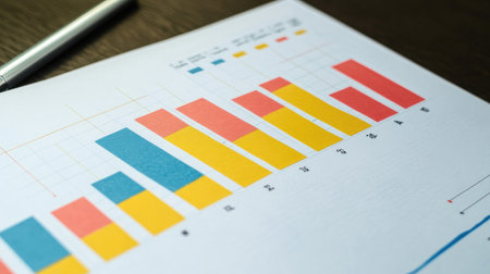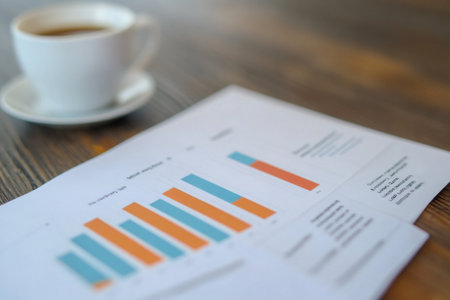 Financial document showing bar charts and data on a wooden table, representing business analysis and marketing strategy