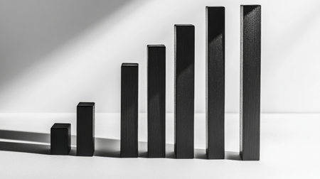 Minimalist D bar chart with tall, sleek bars in monochromatic tones, casting shadows on a clean, white background