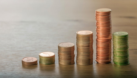Stacks of coins arranged in ascending order, showcasing variety of colors and sizes. image symbolizes financial growth and investment, with neutral background enhancing focus on coins