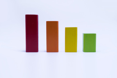 Colorful toys, geometric shapes made of wood on white background. Layout in a bar chart graph.