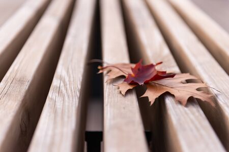 Leaves on the bench. Maple and chestnut leaf on the bench. Details of the autumn park.