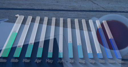 Image of statistical data processing over close up of a digital tablet and coffee cup. Business data technology concept