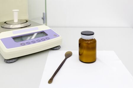 laboratory scales on white table with crusible.Near bottle and spoon brown color with materials .