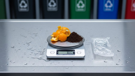 A cinematic environmental wide shot (16:9) capturing a precise moment of waste inspection. A digital