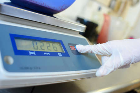 Weighing flour for baking with professional scales at the manufacturing, close-up view