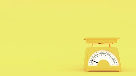 Yellow old kitchen weight scales on yellow background with free space for text. Copy space. 3D rendering.