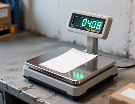 A blank shipping label is weighed on a digital scale in a warehouse environment.