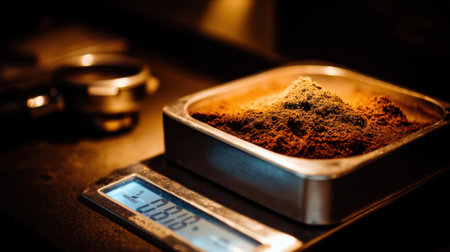 A close-up scene showcasing freshly ground coffee on a precision scale, highlighting the rich texture and aroma in a cozy coffee shop environment.
