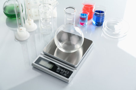 Scale with empty flask and other laboratory glassware on white mirror table