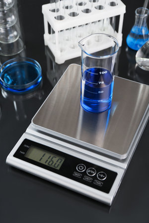 Scale with beaker of sample and other laboratory glassware on black mirror table, closeup