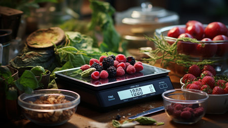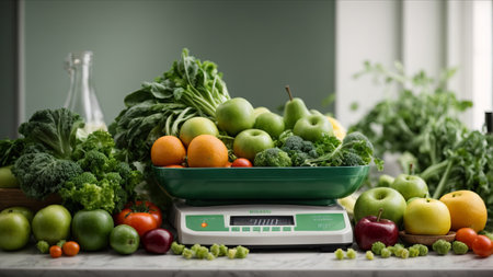 Fruits and vegetables on a kitchen scale. Healthy eating concept.