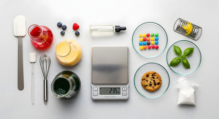 A flat lay composition representing food science or molecular gastronomy. It features a digital scale, laboratory glassware with colorful liquids, kitchen utensils, and various food items like cookies, berries, and candies arranged neatly on a light gray background.