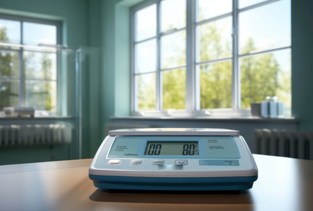A closeup of precision weighing scales with an overlay of blockchainbased encryption icons on the display screen illustrating how weight measurements are securely logged and traced