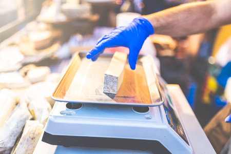 Close up of seller hand putting slice of cheese on weighing machine.