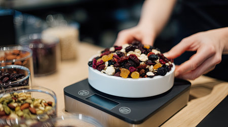 A pair of hands carefully balance a bowl of assorted dried fruits and nuts on a digital scale in a bright kitchen, emphasizing the art of food measurement.