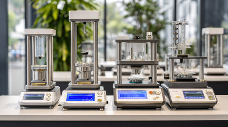 A selection of modern laboratory equipment is showcased on a counter in a bright research facility, ideal for conducting scientific experiments and analysis.