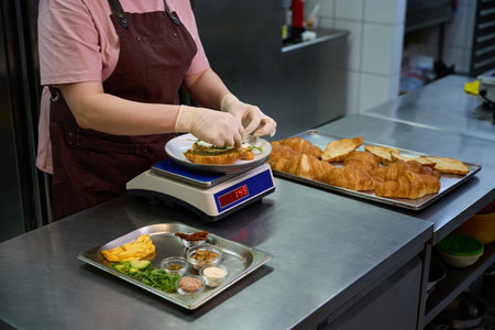 Woman cook creating salad croissant, weighing each ingredient