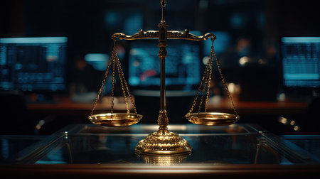 A golden justice scale stands centered on a glass table. It features two balanced pans and an ornate base. The scene uses selective focus, with a dark backdrop featuring computer screens. The lighting suggests an indoor setting, likely a law office or courtroom. This image is suitable for legal, business, or conceptual applications.