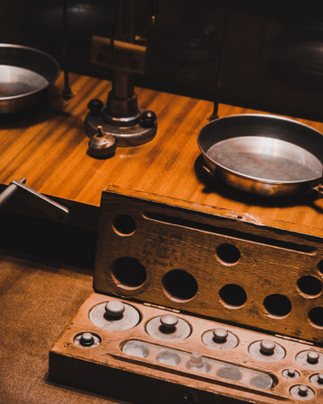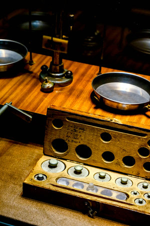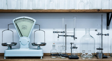 Laboratory setup with vintage scale and glassware on wooden shelf. Science experiment concept for education and research. Laboratory equipment.