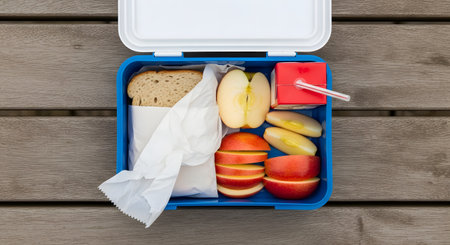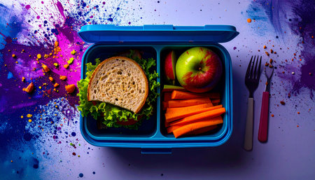 Open lunchbox with healthy school meal including sandwich, apple slices, and carrot sticks, placed on clean white surface, bright colors, photorealistic studio lighting, top down view