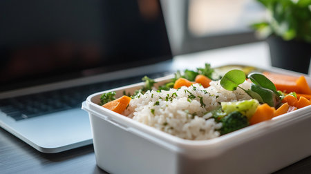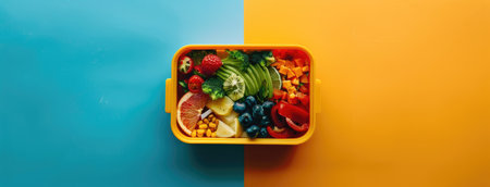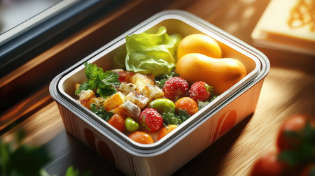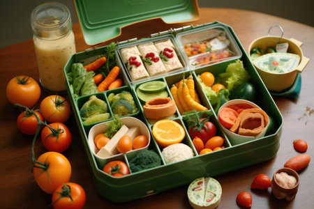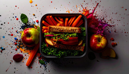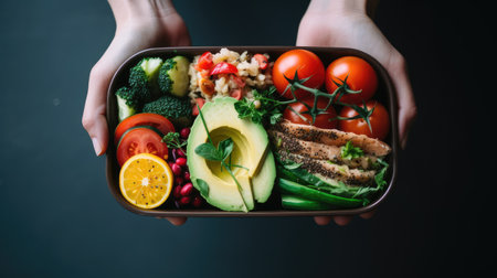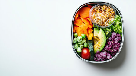 A vibrant and nutritious lunch box featuring an assortment of fresh vegetables, whole grains, and colorful ingredients, perfect for healthy eating and wellness.