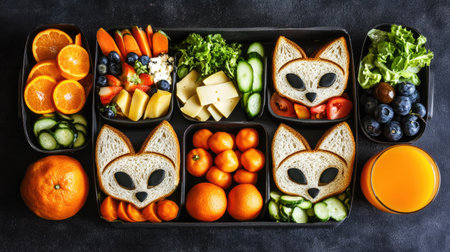 Lunchbox featuring fox-shaped sandwiches, cheese, fresh vegetables, fruits, and a glass of orange juice. Top view with copy space.