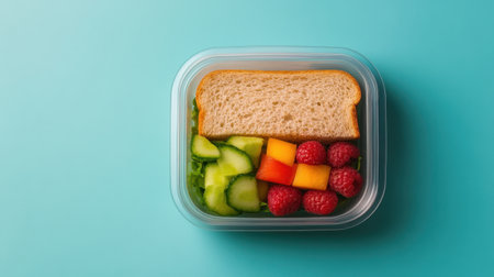 Bright and appealing lunch box scene featuring whole wheat bread, fresh cucumber slices, juicy raspberries, and colorful melon pieces on a vibrant blue background.