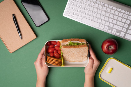 Top view of a young person sitting at her green desk and eating her lunch in front of the computer