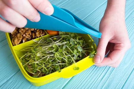 healthy snacks for schoolchildren and students. study and healthy eating.girl holding lunch box with healthy food - carrots, nuts, sprouts