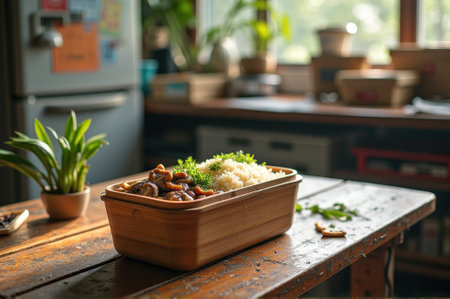 Eco-friendly lunchbox with rice and vegetables on rustic table in sunlit room. That the image is generated using AI.
