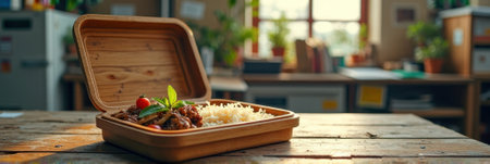 An AI generated illustration of A freshly-prepared lunch in a box sits atop a wooden table.