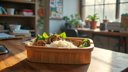 Fresh spinach and mushroom rice in bamboo box on sunny kitchen table. That the image is generated using AI.