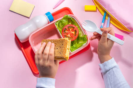 Student carrying healthy lunch inside lunchbox with whole wheat bread, strawberries, broccoli and pasta