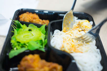 Eating Kanom Jeen Thai rice vermicelli served with curry, Thai Delicious Food