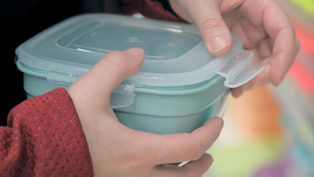 Woman in a store examines a transparent, plastic container for storing food. Camera shoots close up