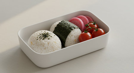 Japanese lunch box with rice, seaweed and vegetables on a white table