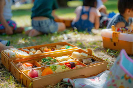 Cute bento boxes with various snacks for children are set up on the grass, with children playing games nearby.