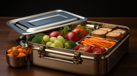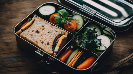 A lunch box with a sandwich and vegetables. Generative AI image.