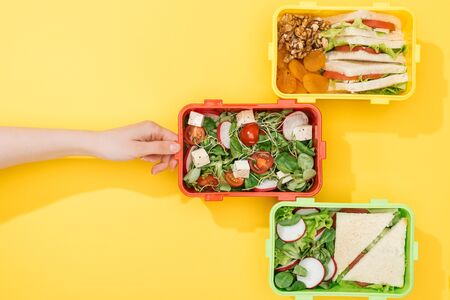 cropped view of woman choosing lunch boxes with food