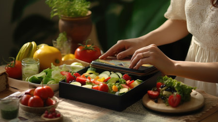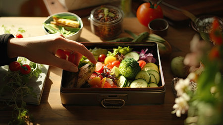 A woman's hand delicately holds a lunch box filled with a healthy and colorful assortment of food. The table is set with care, creating a pleasing scene of balanced nutrition
