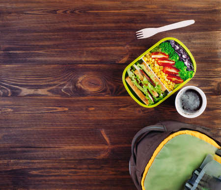 Healthy food concept: Lunch box filled with fresh vegetables and sandwich near cup of coffee and backpack on rustic wooden background with copy space top view, flat lay