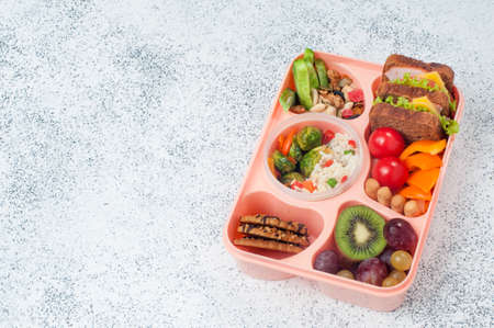 Healthy food concept: Open lunch box with sandwiches, vegetable salad, fresh grape and kiwi, rice with grilled Brussels sprouts and nuts on a gray background with copy space top view, flat lay