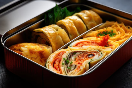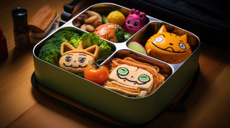A bento box filled with different types of food. AI generative image.