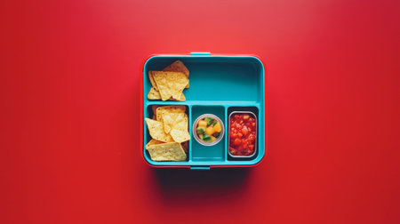 A vibrant lunch box showcases tortilla chips, salsa, and fresh vegetables, perfect for healthy eating and meal prep ideas, set against a striking red background.