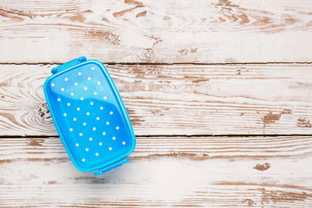 Plastic lunch box on wooden background