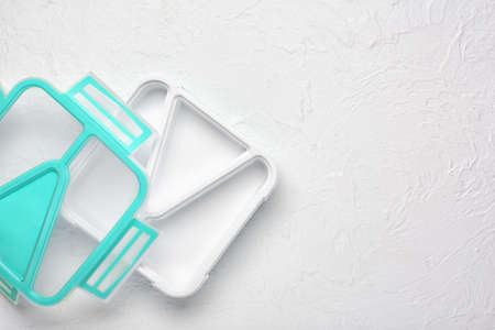 Empty open glass and plastic lunch boxes on blue background close-up, top view.