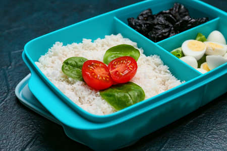 Lunchbox with tasty food on dark background