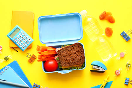 Healthy school meal, back to school concept. Children packed lunch box with balanced diet snack food - yogurt, cereal toast sandwich, apple, fresh vegetable salad, high-colored bright background