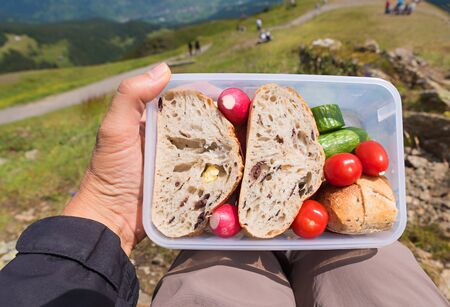man holding Brotzeit box on his knees, with open-faced baguettes and vegetables, lunch for mountaineerer